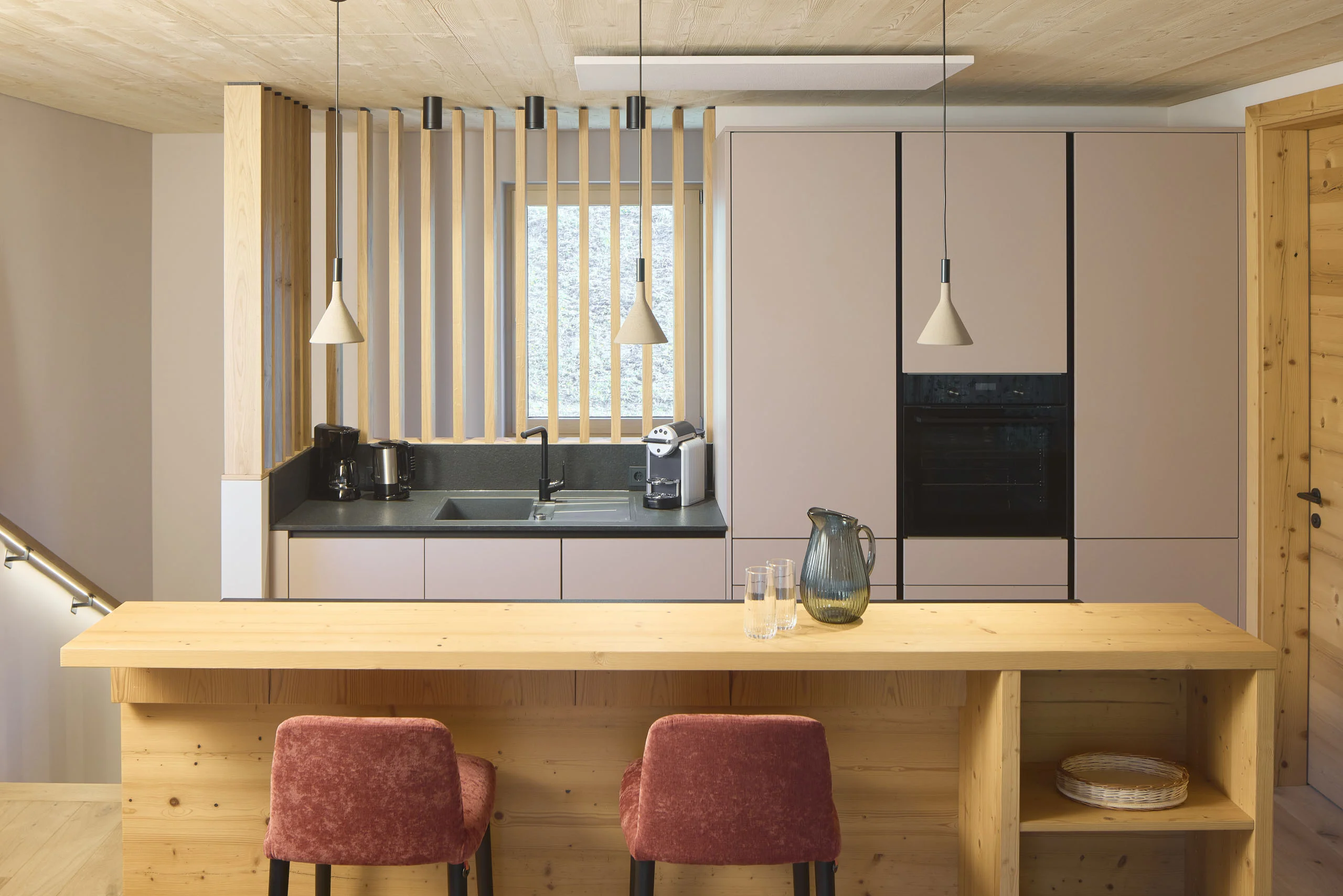 Moderne Küche und Wohnbereich im Hochfeldhof mit Holzdetails